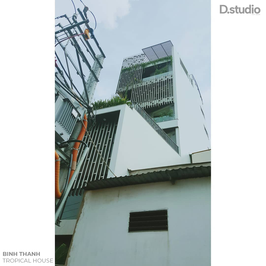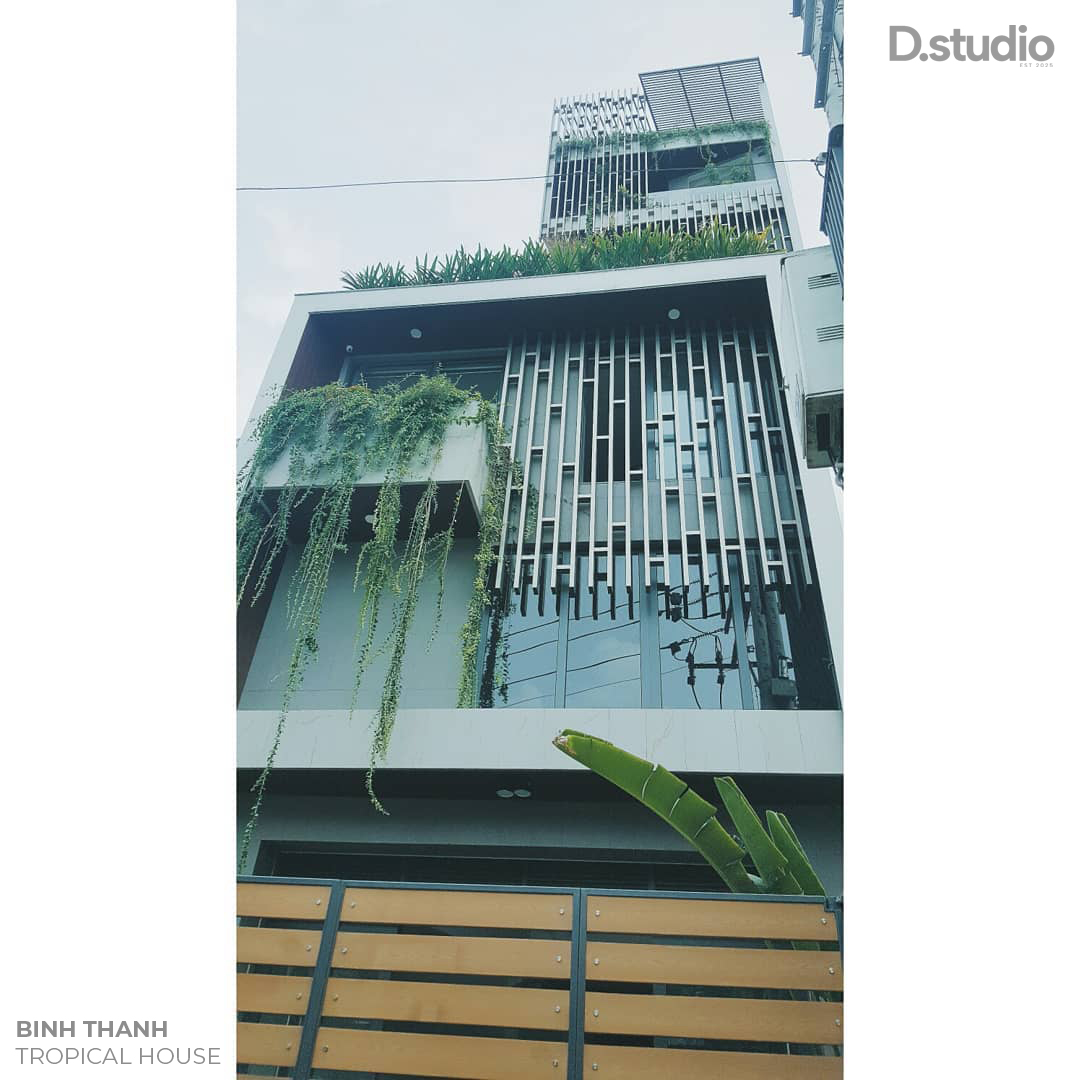 Ngôn ngữ kiến trúc nhiệt đới được thể hiện đậm nét qua cách tổ chức mặt đứng, thông gió chéo, ánh sáng tự nhiên và xen cài mảng xanh. Mặt tiền sử dụng hệ lam nhôm đứng (vertical), vừa tạo hiệu ứng hình khối mạnh mẽ, vừa đóng vai trò như lớp vỏ bảo vệ giảm nhiệt, chắn, nắng hướng Tây và giữ được sự riêng tư. Các bồn cây thẳng đứng và cúc tần rủ xuống tạo